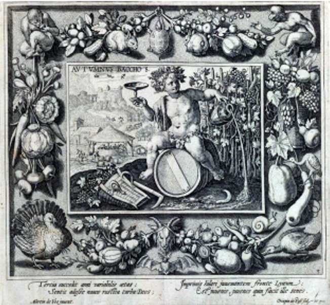 los frutos, o por una figura femenina robusta con ricos vestidos y corona de uvas